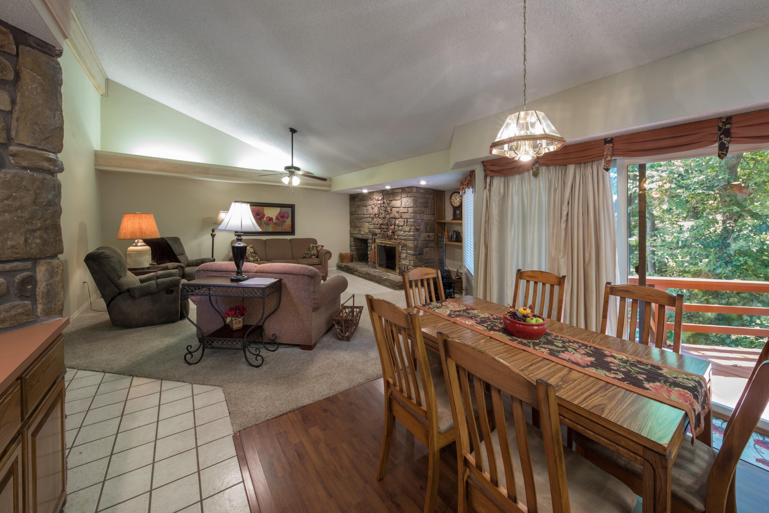 Three Bedroom Suite: Features a king size bed in the master bedroom and a full size bed in each of the guest rooms. The unit includes a full kitchen, a sleeper sofa, and two bathrooms. Equipped with A/C, a fireplace, and a TV with a DVD player. This room has a maximum occupancy of 8 and sleeps 6 privately.